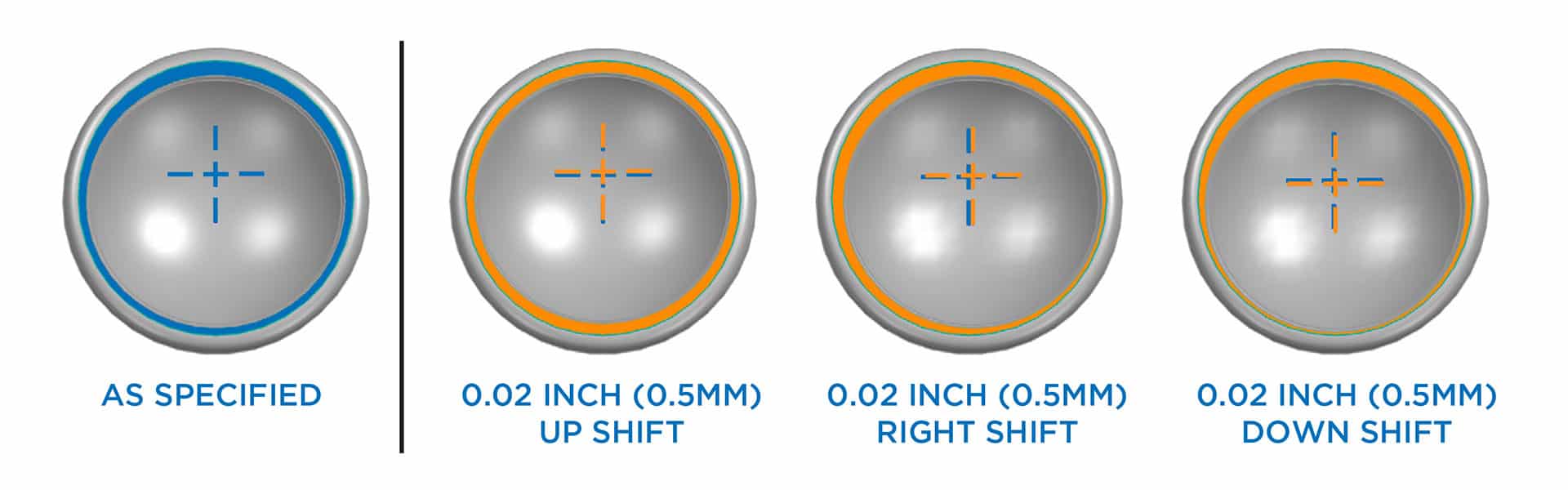 La superficie dell’inserto omerale inverso è mostrata: 1) come specificato e 2) con tre possibili variazioni di produzione del centro di rotazione. Il blu indica il centro di rotazione specificato, l’arancione indica la posizione spostata.